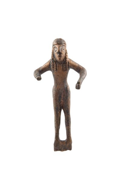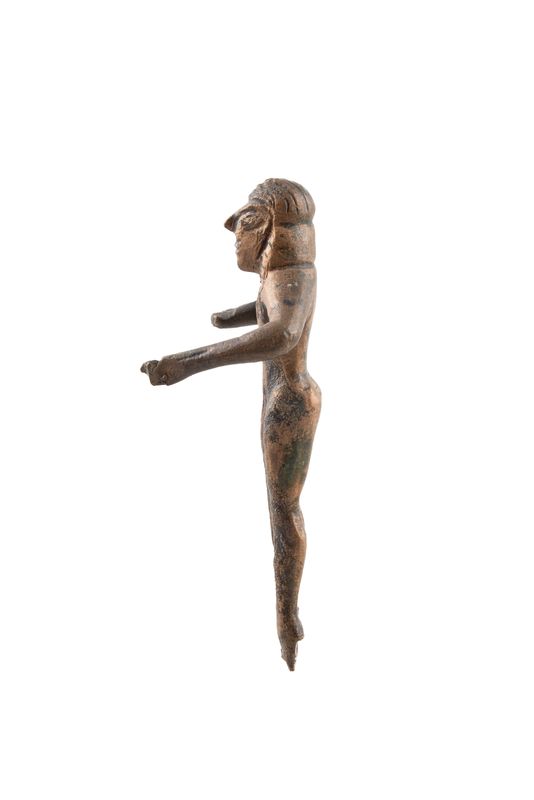 The charioteer is naked with his arms bent at the elbow and stretched out in the front so that he held the horse’s reins. The hair is long and two locks fall on his chest, framing the neck. The hair details are incised. The eyes are big, the nose is beak-shaped and an incised line denotes the mouth.