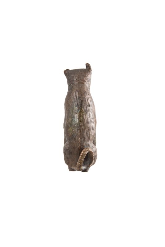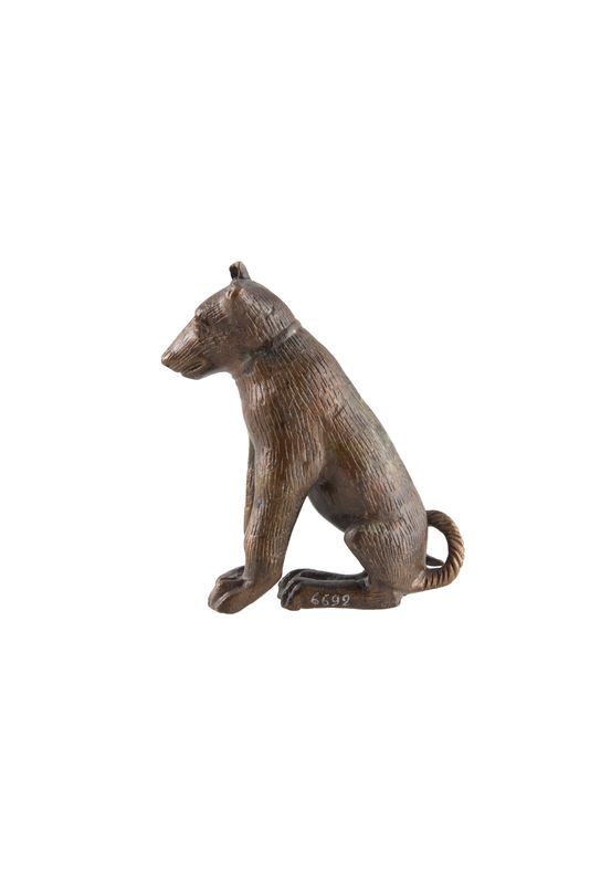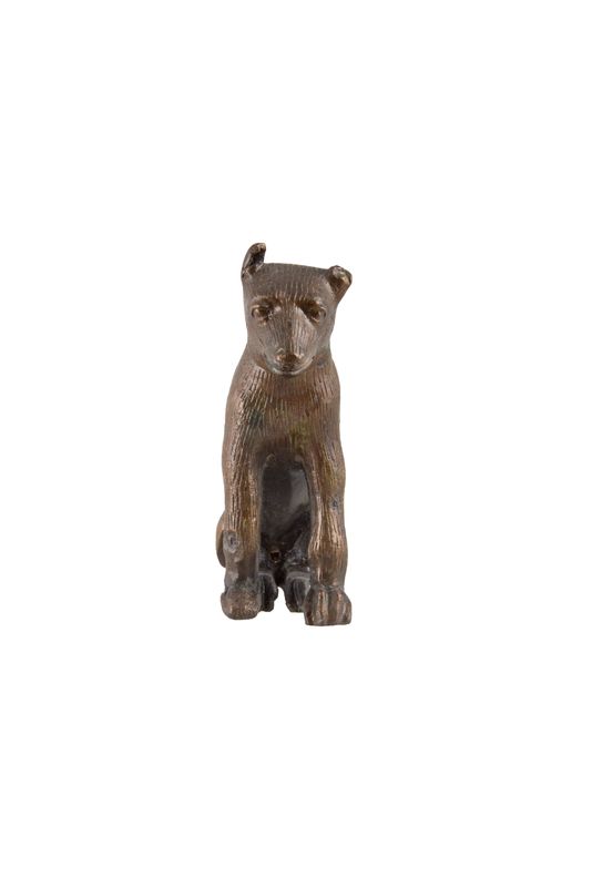 Intact dog figurine. The animal sits on its hind legs, lowering its big head. The short ears are raised, the front legs strong and the tail slender and long. Short incisions all over the body render the dense coat of the animal that has a collar around its neck.