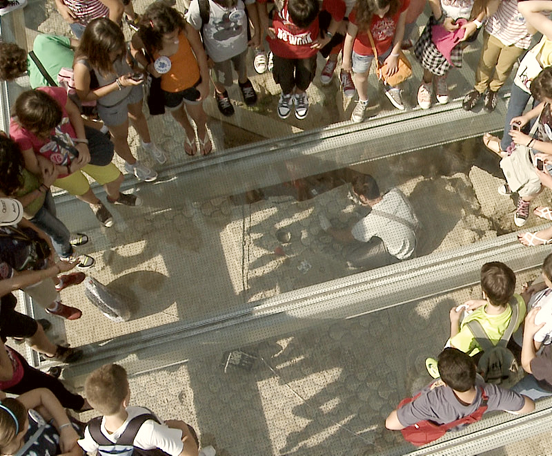 One of the Acropolis Museum peculiarities is that it has incorporated in its architectural design the ruins of the ancient neighbourhood that were brought to light during the archaeological excavation conducted for the Museum’s construction. These ruins, visible through the glass floor and the Museum’s balconies, converse with the masterpieces of the ancient Greek civilisation that are exhibited in its galleries.