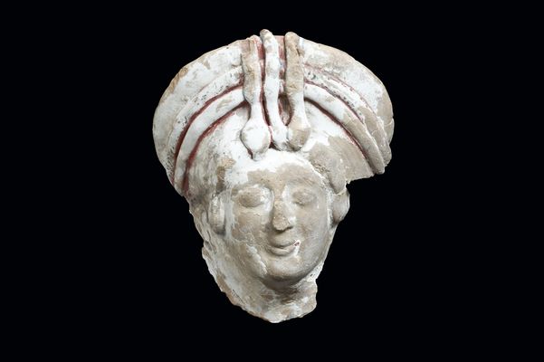 Female protome that once surmounted a clay plaque, broken at one side. It was found during one of the Acropolis excavation campaigns. The woman smiles and has a tall stephane adorned with handmade bands on her head. The ears are painted black and the hair forms locks that cover the forehead. The surface preserves white slip, as well as black, red and blue colour.