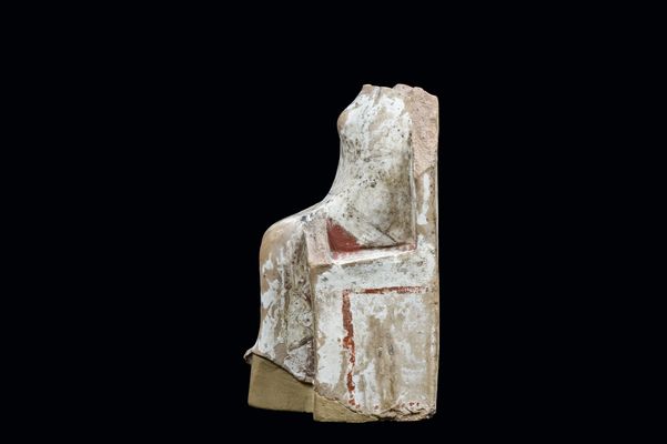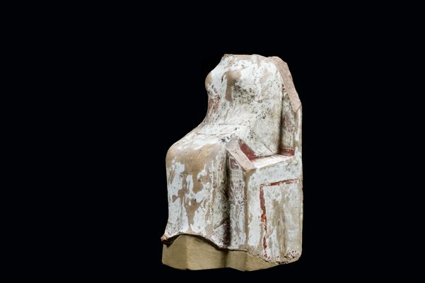 Figurine of a seated goddess found during one of the Acropolis excavation campaigns. The goddess sits on a throne amply decorated with painted ornaments. Her hands schematically rendered rest on her knees. She wears chiton with red hem and himation once adorned with red and black motifs.