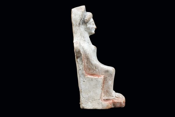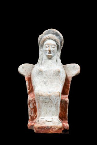 Figurine of a seated goddess found during one of the Acropolis excavation campaigns. The goddess sits on a throne and her schematically rendered hands rest on her knees whereas her feet on a footstool. She wears a chiton decorated once with painted motifs. The black hair frames her forehead and falls over the shoulders. On her head she has a stephane