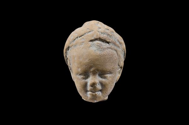 The face is ovoid, the forehead tall and the eyes small with accentuated lids. The lips are full and the child smiles. The hair is braided into a plait wrapped around the head. Preserved are traces of white slip.