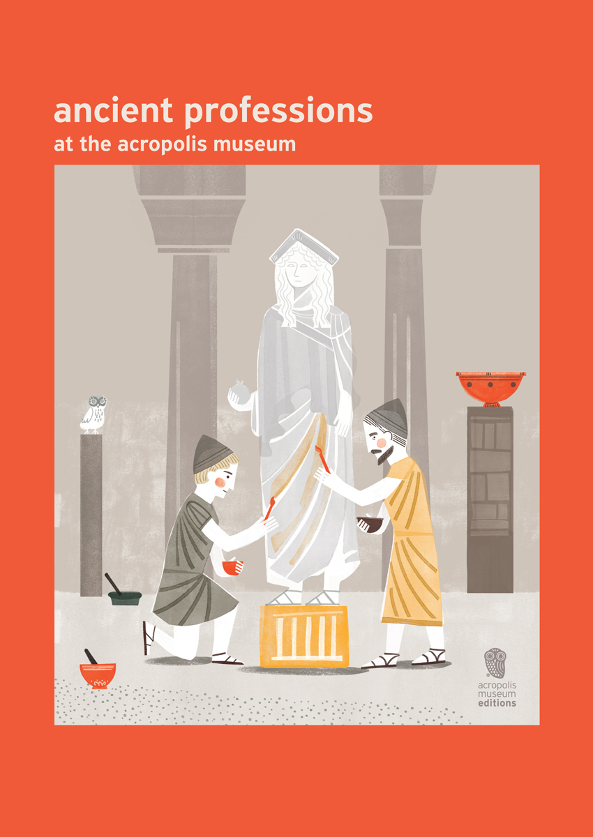 Athena Ergane, the goddess of labour, accompanies kids on an observation game in the galleries of the Acropolis Museum. Together they discover artefacts that transport them in different work places of the ancient Athenians, they meet craftsmen and professionals that talk to them about their jobs,while the goddess lets the young visitors in on some hidden secrets! Twelve short stories, twelve ancient professions unfold in the pages of this booklet, revealing some of the trades that made people’s lives better.