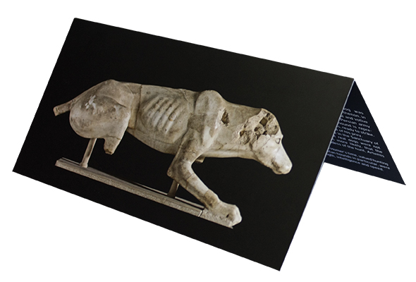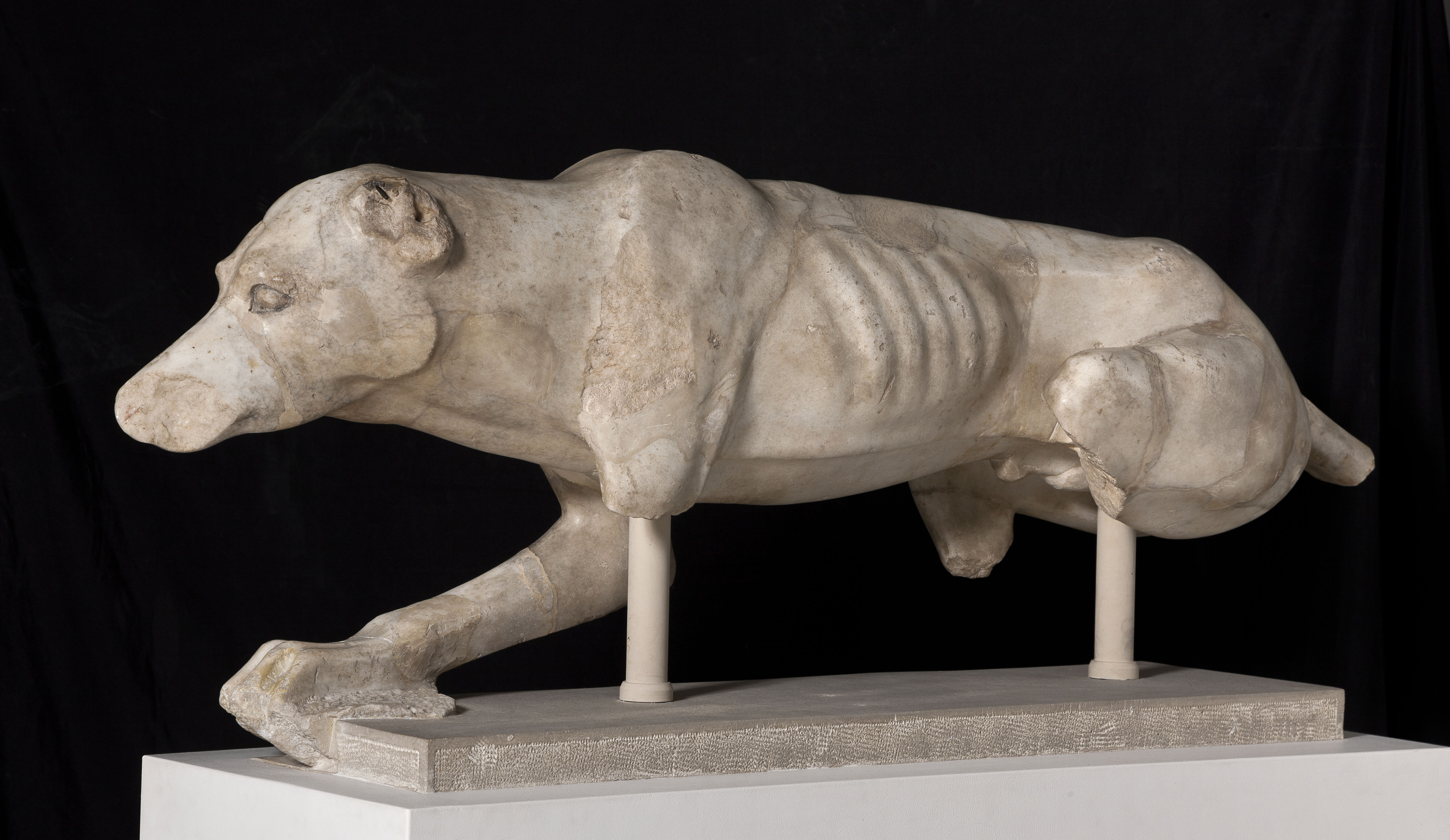 During excavations south of the Parthenon, within a layer of ancient destruction, a life-sized, nearly intact, marble dog was unearthed. The animal is shown with muscles tensed, his body poised for attack, as he seems to have caught sight of his prey. His discovery in the sanctuary of Athena is puzzling, as dogs were not permitted there. On the contrary, they were well-known companions of Artemis, goddess of the hunt, who had a small sanctuary of her own near the Parthenon. The ancient Greeks, already from Homer’s time, greatly valued hunting dogs, with the hounds of Laconia and Crete especially prized for their strength, intelligence and speed.