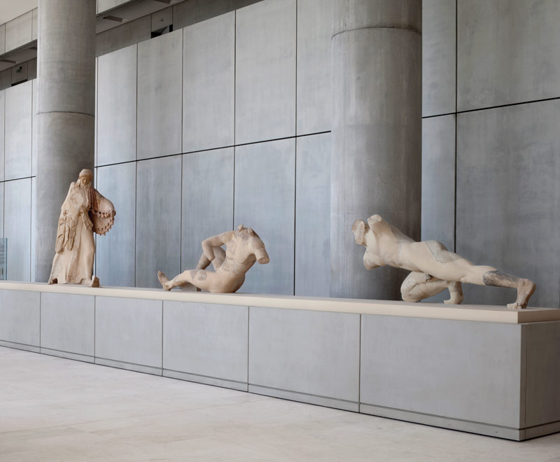 Ο πρώτος μνημειακός ναός της Ακρόπολης ιδρύεται στη θέση του μικρού πλινθόκτιστου ναού της Αθηνάς Παρθένου. Οι αρχαιολόγοι τον ονομάζουν «αρχαϊκό Παρθενώνα» και πιθανότατα πρόκειται για τον Εκατόμπεδο που αναφέρουν οι αρχαίες πηγές. Πότε ακριβώς κατασκευάζεται δεν είναι γνωστό, πολλοί ωστόσο συνδέουν την οικοδόμησή του με την καθιέρωση της γιορτής των Μεγάλων Παναθηναίων, το 566/5 π.Χ. Παρότι τα θεμέλια του Εκατομπέδου έχουν εξαφανιστεί, την ύπαρξή του μαρτυρούν τα μεγάλα γλυπτά και τα αρχιτεκτονικά μέλη που αποκαλύφθηκαν κοντά στον κλασικό Παρθενώνα και σήμερα παρουσιάζονται στην αρχή της αίθουσας.