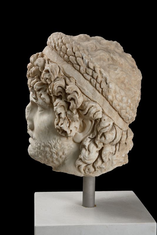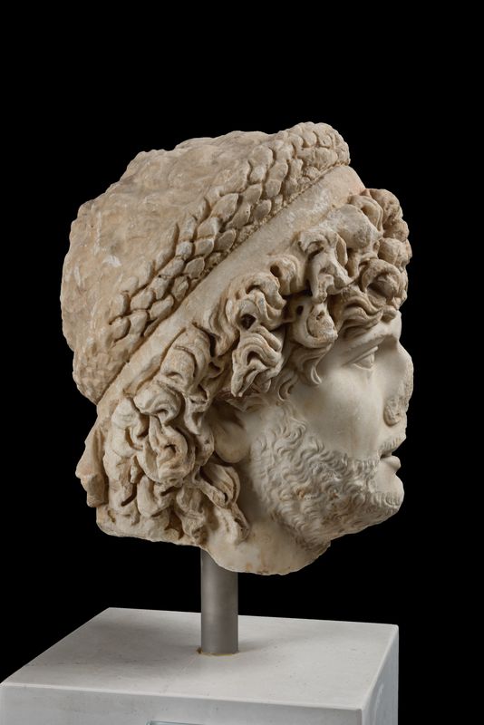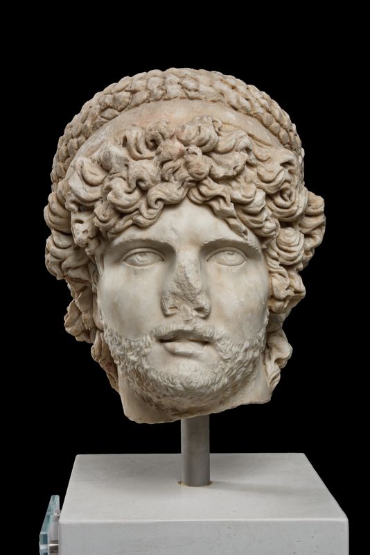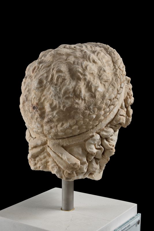 Εικονίζεται νέος άνδρας με σγουρά μαλλιά, κοντό γένι και μουστάκι που σκεπάζει το πάνω χείλος. Το πρόσωπο είναι εύσαρκο και τα μάτια σκιάζονται από μακριά, σχεδόν οριζόντια, φρύδια. Τα μαλλιά σχηματίζουν χοντρές μπούκλες που κατεβαίνουν χαμηλά στο μέτωπο και καλύπτουν τον αυχένα. Στο κεφάλι φοράει διπλό διάδημα, δηλωτικό της ιερατικής του ιδιότητας. Το διάδημα αποτελείται από στεφάνι με τέσσερις σειρές φύλλων μυρτιάς και στρόφιον που δένεται πίσω με διπλό κόμπο.