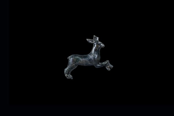 Έλασμα λαγού το οποίο προέρχεται από τη διακόσμηση χείλους ή λαβής μεγάλου χάλκινου σκεύους, πιθανόν λέβητα ή τριποδικής βάσης. Ο λαγός αποδίδεται φυσιοκρατικά να τρέχει προς τα δεξιά και τα ενωμένα μπροστινά του πόδια, σηκώνονται ψηλά. Τα μικρά ορθογώνια ελάσματα, συμφυή στα άκρα του ζώου, διατηρούν χάλκινα καρφιά για την προσάρτησή του στο σκεύος.