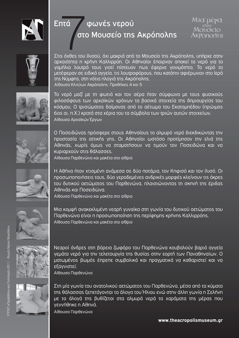 Έντυπο για τη σημασία του νερού στον αρχαίο κόσμο, όπως αναδεικνύεται μέσα από επτά εκθέματα του Μουσείου. Συνόδευε τις θεματικές παρουσιάσεις που πραγματοποιήθηκαν στο Μουσείο Ακρόπολης στο πλαίσιο της πανελλαδικής δράσης του Υπουργείου Πολιτισμού και Τουρισμού με θέμα «Περιβάλλον και Πολιτισμός 2011» (8/10 - 9/10/2011).
