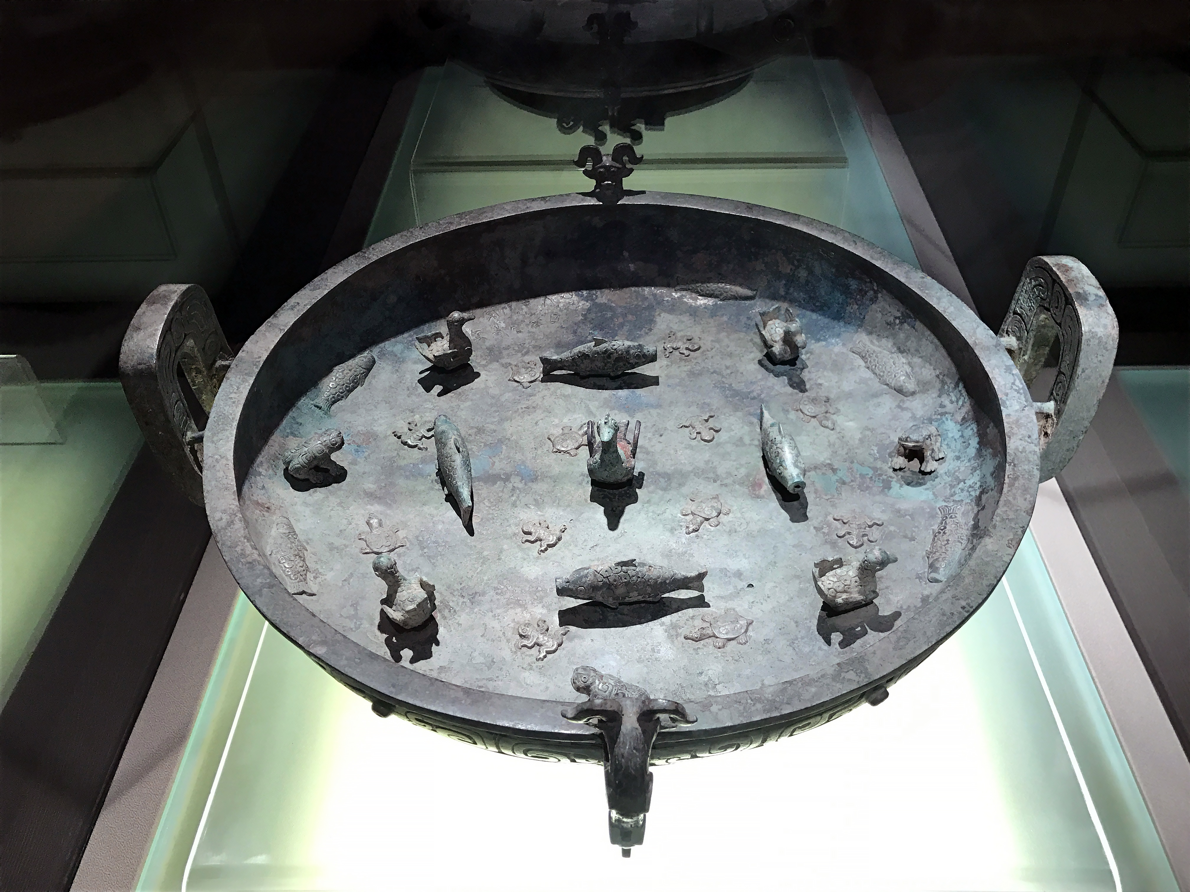 Το πρώτο έργο τέχνης είναι μια χάλκινη τελετουργική λεκάνη που είχε κατασκευαστεί για την πριγκίπισσα Zi Zhong Jiang (770 - ύστερος 7ος αι. π.Χ.) και χρησίμευε ως αγγείο νερού για το πλύσιμο των χεριών πριν από τις ιεροτελεστίες και τα συμπόσια. Η καινοτόμα διακόσμηση του σκεύους με σχηματοποιημένα ζωόμορφα μοτίβα και ειδώλια, μοναδική στα χάλκινα σκεύη της εποχής, καθιστά τη λεκάνη του Μουσείου της Σαγκάης ένα πραγματικά σπάνιο αριστούργημα της Κινεζικής χαλκοτεχνίας.