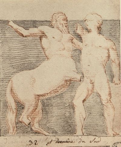 Αντίγραφο της μετόπης 32, η οποία βρίσκεται στο Βρετανικό Μουσείο του Λονδίνου. Ένας Λαπίθης στα δεξιά παλεύει με Κένταυρο. Ο Κένταυρος έχει ανασηκωθεί στα πίσω πόδια, έχει αρπάξει τον άνδρα από το πίσω μέρος του κεφαλιού και ετοιμάζεται να τον χτυπήσει με κάποιο αντικείμενο που θα κρατούσε στο υψωμένο δεξί χέρι του. Ταυτόχρονα ο Λαπίθης τραβά πίσω το αριστερό του χέρι και ετοιμάζεται να καταφέρει ένα γερό χτύπημα στον αντίπαλό του.