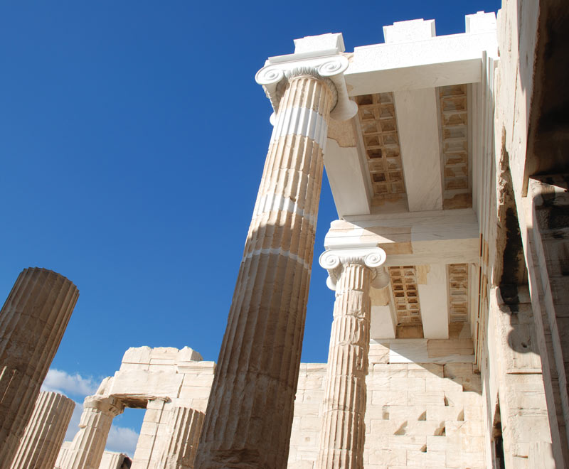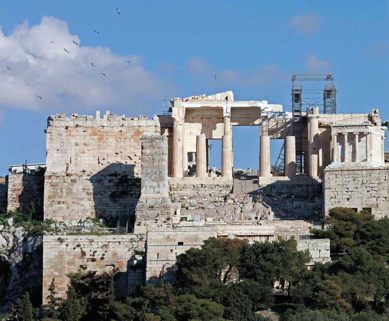 Τα Προπύλαια, η μνημειακή είσοδος στο ιερό της Ακρόπολης, χτίζονται μεταξύ του 437 και του 431 π.Χ., σε σχέδια του Μνησικλή, στη θέση αρχαιότερης πύλης. Το αρχικό σχέδιο δεν ολοκληρώνεται ποτέ, καθώς η κατασκευή σταματά τις παραμονές του Πελοποννησιακού Πολέμου, το 431 π.Χ.