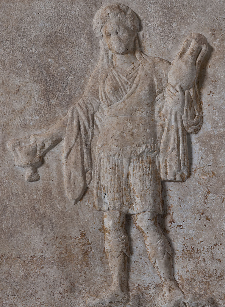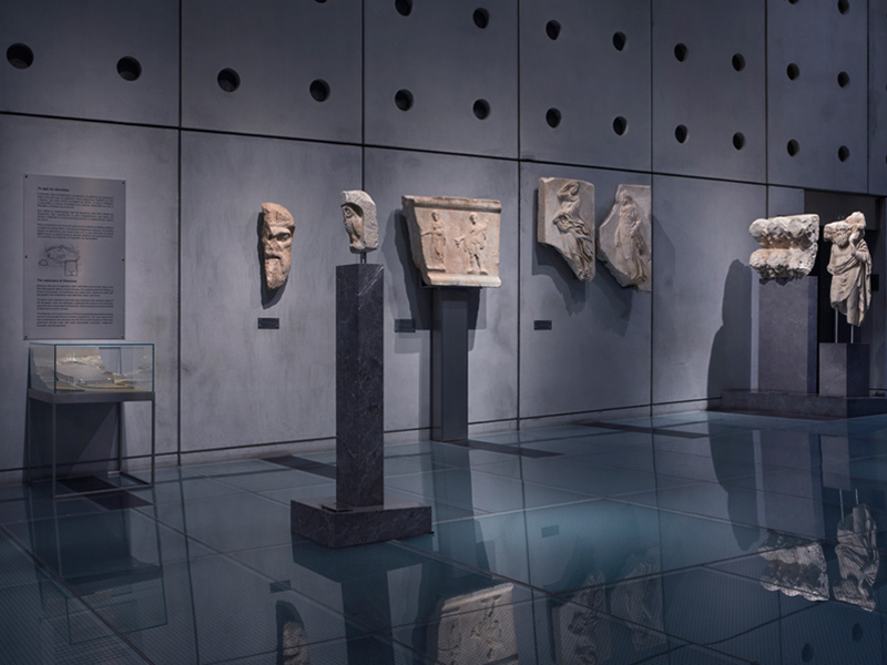 Η αριστερή πλευρά της αίθουσας κλείνει με ευρήματα από το ιερό και το θέατρο του Διονύσου, θεού της βλάστησης και του κρασιού. Το ιερό ιδρύεται στη νότια πλαγιά της Ακρόπολης μετά τα μέσα του 6ου αι. π.Χ. Είναι το σημαντικότερο ιερό του θεού στην Αθήνα και εδώ γιορτάζονται τα Μεγάλα ή εν Άστει Διονύσια, η λαμπρότερη γιορτή προς τιμή του θεού. Από τα λατρευτικά δρώμενα, που αναπαριστούν τη ζωή και τα πάθη του Διονύσου, γεννιέται το δράμα, η καθιέρωση δραματικών διαγωνισμών και τελικά η τέχνη του θεάτρου.
