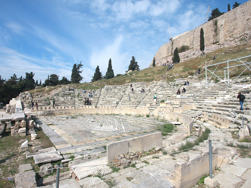 Το θέατρο του Διονύσου, το αρχαιότερο του κόσμου, βρίσκεται στην πλαγιά πάνω από το ιερό. Στην τελική μορφή του χωράει 16.000 θεατές. Εδώ τελειοποιούνται οι τρεις μορφές του αρχαίου δράματος -η τραγωδία, το σατυρικό δράμα και η κωμωδία- και εδώ παίζονται για πρώτη φορά τα έργα των σημαντικότερων αρχαίων τραγικών και κωμικών ποιητών: του Αισχύλου, του Σοφοκλή, του Ευριπίδη και του Αριστοφάνη.