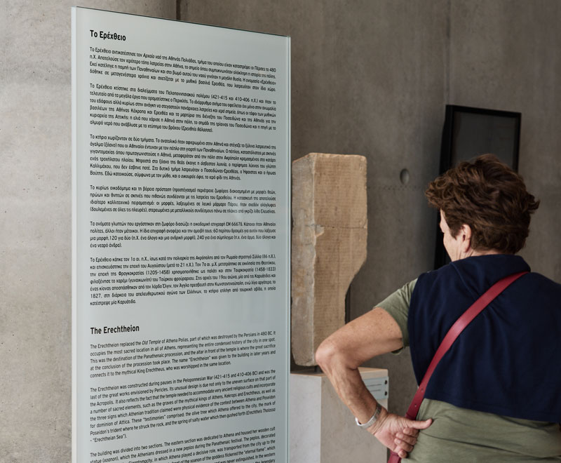 Ένα ασυνήθιστα ξεχωριστό μνημείο της Ακρόπολης, το Ερέχθειο, στέκει στα βόρεια του Ιερού Βράχου και μαγεύει τους επισκέπτες με την ευρηματική αρχιτεκτονική του, τον περίτεχνο γλυπτό διάκοσμό του και τη μακρόχρονη ιστορία του. Αποτέλεσε κέντρο της λατρείας της πολιούχου θεάς της πόλης και ομφαλό ιερών σημείων, παλαιών λατρειών και τοπικών παραδόσεων του αθηναϊκού παρελθόντος. Σε αυτόν τον ναό συνυφαίνονται η αρχιτεκτονική με την τέχνη, η λατρεία με την καθημερινότητα, οι ιστορίες θεών και ανθρώπων.